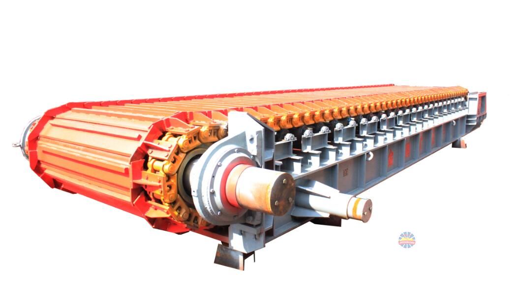 采用節(jié)距為228.6mm的高強(qiáng)度模鍛鏈條為牽引件,兩根鏈條繞過安裝在機(jī)體頭部的一對(duì)驅(qū)動(dòng)鏈輪和機(jī)體尾部的一對(duì)張緊輪聯(lián)成封閉形回路,在兩排鏈條的每個(gè)鏈節(jié)上裝配了相互交迭的、重型結(jié)構(gòu)的輸送槽而成為一個(gè)連續(xù)的能夠運(yùn)載物料的輸送線路。其自重和物料的重量由安裝在機(jī)體上的多排支重輪、鏈托輪和滑道梁支承。傳動(dòng)系統(tǒng)經(jīng)交流變頻調(diào)速電動(dòng)機(jī)聯(lián)接減速機(jī),再由漲套與驅(qū)動(dòng)裝置直聯(lián)驅(qū)動(dòng)運(yùn)載機(jī)構(gòu)低速運(yùn)行。將尾部料倉(cāng)卸入的物料沿輸送線路運(yùn)至機(jī)體的前方排出,實(shí)現(xiàn)向下方的工作機(jī)械連續(xù)均勻喂料的目的.